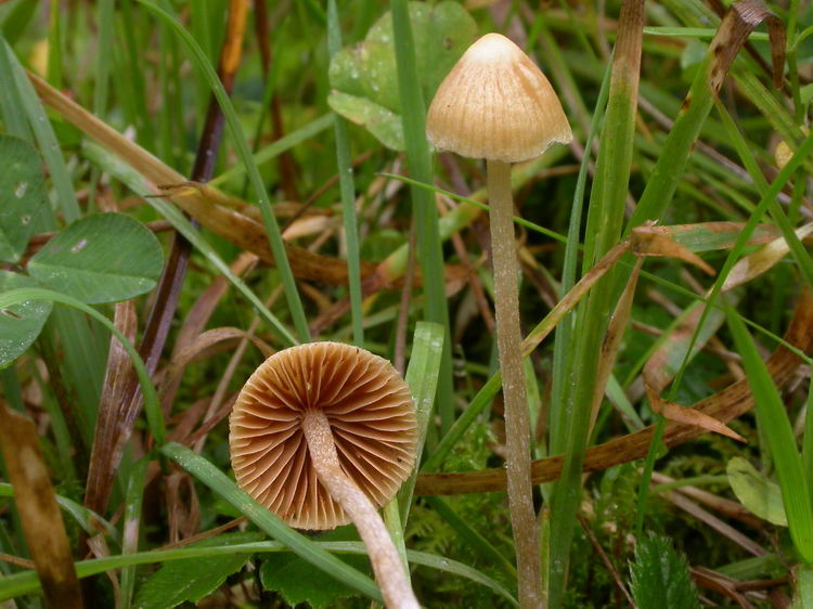 Beschreibung:Hut: bis 1,8 cm breit, blütenhonigbraun, bis auf den glatten Scheitel durchscheinend gerieft, stark hygrophan und schnell ausblassend; Stiel: dünn, brüchig, sehr lang (bis 10 cm), creme- bis blass ockerfarben, bereift; Lamellen: mäßig gedrängt (ca. 18-20 durchgehend), untermischt; Cheilozystiden: tibiiform, auch doppelt tibiiform und beisweilen mit Sekundärsepten, keine Schnallen beobachtet; z.B. (Länge x Bauchbreite x Kopfbreite) 32x8x6; 40x7,5x7; 36x7x7; 36x8x7; 32x9x6 (unseptierte gemessen); Pleurozystiden: keine beobachtet; Basidien: zylindrisch, 4-sporig, ca. 30x9 (ohne Sterigmen); Kaulozystiden: wie Cheilos geformt, z.B. 58x10x9; keine Schnallen beobachtet; Pileozystiden: im Skalp keine gefunden; Sporen: 12,2 x 6,8; 11-13 (-15) x 6-7,5; Q=1,8 (1,7-1,9), (10 Sp. gemessen), elliptisch bis schwach mandelförmig, bisweilen angedeutet citriform (mit papilliertem Ende), mäßig warzig;