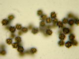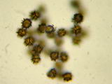 Mikromerkmale vom Exsikkat (2018 mikroskopiert): HDS: Die schmalen zylindrischen, nicht gelifizierten Endzellen der Epicutis entspringen aus deutlich verdickten, teil puzzelteilartig aufgetriebenen Zellen; Sporen: breit ellipsoid bis subglobos, Ornament aus Stachelwarzen, kräftigen Graten und feinen Linien, nicht netzig, aber deutlich gratig, teils angedeutet zebriert, Ornamenthöhe ca. 0,5-1,2 µm; Stachelwarzen fast spitz; Plage inamyloid; Maße: 8,2 x 7,1 (7,3-9,7 x 6,6-8,0), Q=1,16, 20 Sp. gemessen; Bestimmung: Unklar. 2006 offenbar aufgrund der Huthautstruktur ss. Basso als britannicus bestimmt. Die deutlich gratigen Sporen mit inamyloider Plage sprechen aber auch nach Basso eher für fulvissimus, wenngleich die Stachelwarzen locker über 0,8 µm Höhe erreichen. |