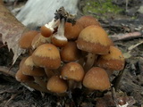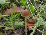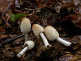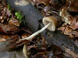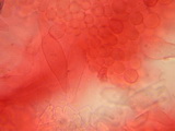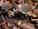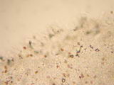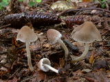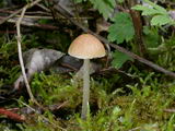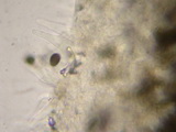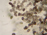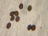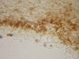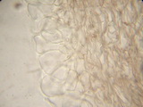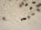| Funddaten: 12.09.2007; MTB 8036/4/4/3, 660 m, Mangfalltal, bei Fichte und Buche, vergesellschaftet mit Laccaria amethystina, Hebeloma spec. und Russula fellea, in und auf Laubstreu mit Holzstückchen (Buche) und Bucheckern; gesellig (5 Fk); Hut: bis 3,2 cm breit, jung stumpf kegelig, später konvex, aber nicht ganz ausgebreitet, schwach und stumpf gebuckelt, wachsig-glatt, junge Fk gänzlich rötlich braun, später am Scheitel rötlichbraun, darunter dunkel graubraun, jung kaum, nach dem Aufschirmen fast bis zum Scheitel durchscheinend gerieft, junge Fk etwa unterhalb des Scheitels abwärts dicht mit weißen, langen Velumfasern besetzt, die am Rand fransig herabhängen, bei älteren Fk sind die Velumreste nur mehr am Hutrand und nicht mehr herabhängend vorhanden und verschwinden schließlich ganz, Hut hygrophan, am Scheitel zunächst ocker, dann abwärts milchkaffeefarben ausblassend; Stiel: bis 5,5 x 0,4 cm, hohl, schlank, zylindrisch, basal gleichdick oder schwach erweitert, cremefarben, an der Spitze weißlich bereift, darunter weißlich beflockt bis überfasert, im Alter verkahlend; Lamellen: gerade und breit angewachsen, mäßig gedrängt, jung hellgrau und unter dem Hutfleisch ockergrau, reif dunkler grau bis graubraun und im Alter durch die Sporen grauschwarz überzuckert, Schneiden gleichfarbig (nicht rötlich unterlegt) und feinst weißflockig; Fleisch: im Hut wässerig ockerbraun, im Stiel cremefarben, im unteren Stieldrittel etwas dunkler ockerbräunlich; Geruch: unauffällig, schwach angenehm pilzig; Geschmack: -; Velum: hyphig, Zellbreite ca. 6-15 µm, Schnallen vorhanden; Stielhyphen mit Schnallen; Cheilozystiden: spindelig-bauchig bis lageniform, ca. 41-55 x 11-15, mit wenigen Parazystiden untermischt, dicht stehend; Pleuros ähnlich, recht spärlich; Pleurozystiden: ähnlich wie die Cheilos; Kaulozystiden: -; HDS: aus blasigen, bis über 50 µm breiten, dickwandigen Zellen, Pigment membranär, inkrustierend (?), in den darunterliegenden Hyphenschichten intrazellulär; Basidien: 4-sporig; Sporen: ellipsoid, im KOH dunkelbraun ohne Rottöne, KP deutlich, ca. 1,5 µm breit, 8,8 x 5,8 (8-9,5 x 5-6,5), Q=1,53 (1,4-1,6); Sporenpulver: -; Bestimmung: Psathyrella impexa, Ungekämmter Mürbling |