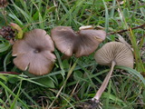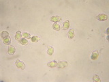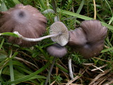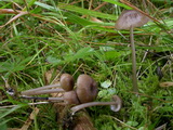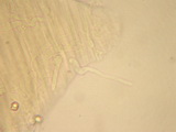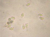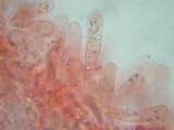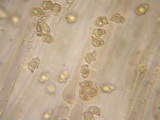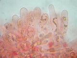 | Funddaten: 12.08.2007; MTB 8332/3/2/4, 1500 m, U-Ammergau, Kappel; am Stierkopf, praktisch am Gipfel auf magerer Weide; gesellig (ca. 6 Fk); Hut: bis gut 3 cm breit, zuerst halbkugelig, dann ausgebreitet, zuerst liegend befasert, um den Scheitel mit feinen Schüppchen, dann faserschuppig aufreißend, am Scheitel schwach genabelt, zumindest farblich dunkelbraun abgesetzt, Färbung jung dunkelbraun, später mehr graubraun, wobei die dunkleren Schüppchen sich deutlich abheben, frisch zu 2/3 schwach durchscheinend gerieft, hygrophan; Stiel: bis gut 5 cm lang, dünn, zylindrisch, basal kaum verdickt, glatt, jung auf ganzer Länge stahlblau, dann nach dunkel graubraun umfärbend und zuletzt olivbraun, Basis weißfilzig; Lamellen: mäßig gedrängt, breit angewachsen, untermischt, Schneiden glatt, blass graubraun, bei Reife rosabraun; Fleisch: extrem dünn, wässerig graubraun, in der Stielrinde (Stiel hohl) graublau; Geruch: schwach, uncharakteristisch; Geschmack: -; Lamellentrama: -; Cheilozystiden: fehlen, LS fertil;; Kaulozystiden: -; HDS: Cutis, Zellbreite ca. 5-10, Schuppen aus dickeren, keuligen Zellen (ca. 10-18 breit), ohne Schnallen, Pigment intrazellulär, teilweise körnig; Basidien: 3-4-sporig, kurz (ca. 26-27 x 10-11), keine Schnallen gesehen (Präparate stark kollabiert); Sporen: heterodiametrisch, mit 5-8 Ecken, bisweilen wellig, 10,1 x 6,9 (9-11,5 x 6-7,5), Q=1,46 (1,3-1,7), 30 Sp. gemessen; Bestimmung: E. asprellum, nicht ganz abwegig wäre auch E. huismanii bzw. chloropolium ss. Ludwig; |