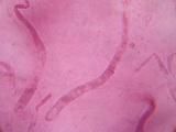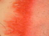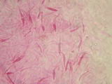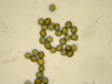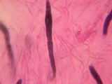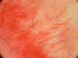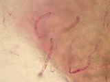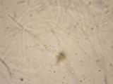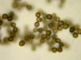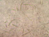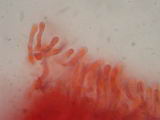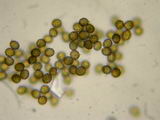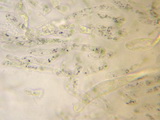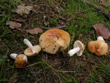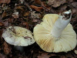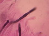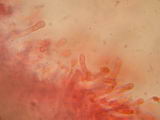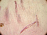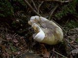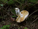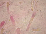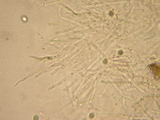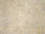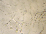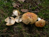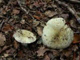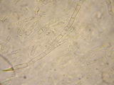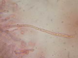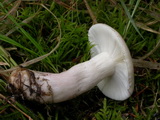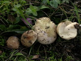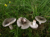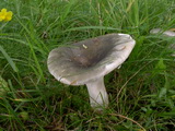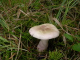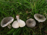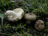 | Funddaten: 05.07.2007, MTB 7935/1/3/2, 570 m, Pullach, Heilmannpark; bei solitärer Birke und Apfelbaum, in der Wiese; gesellig;; Hut: bis 7 cm breit, im Zentrum schon früh leicht, später deutlich vertieft, Huthaut matt bis speckig glänzend, befeuchtet ziemlich klebrig (Oberlippentest!), manchmal etwas felderig rissig, Farben graugrün, im Zentrum meist dunkler, dunkel braungrün, bis weilen auch mit violettgrauer Färbung, zum Rand hin oft blasser, Rand schon jung etwas gerieft, alt auf knapp 1 cm fast kanelliert, Huthaut zu 2/3 leicht abziehbar; Stiel: bis 5 cm lang, ca. 1,5 cm breit, zylindrisch, weiß, gelbbraun fleckig, vor allem zur Basis hin; Lamellen: gerade angewachsen, am Ansatz oft gegabelt, mäßig gedrängt, am Grund queraderig, cremeweiß, in der Aufsicht satt creme, Schneiden häufig rostbraun gesprenkelt; Fleisch: weiß, ziemlich kompakt, im Schnitt nicht verfärbend; Geruch: angenehm obstartig; Geschmack: Fleisch mild, nussig, Lamellen leicht schärflich; Chemie (Reaktion auf Stielrinde): FeSO4 sofort blass orangerosa, Guajak langsam dunkelgrün, Phenol langsam rosabraun; HDS: Haare: kurz und mehrfach gegliederte Ketten aus leicht angeschwollenen bis tönnchenförmigen Zellen, Endzellen oft verlängert, zylindrisch und abgerundet, z.B. 22x4, 15x6, 20x4, 17x3, Breite der Kettenglieder meist um 5, bisweilen auf 6-9 angeschwollen; Pigment intrazellulär, körnig, schwarzblau;
