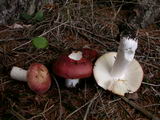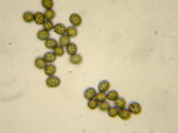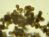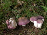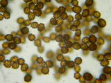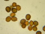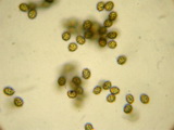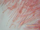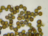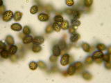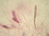 Pileozystiden: schlankkeulig, schlangenförmig, unseptiert, in SV grau bis graubraun, Kopfbreite 5-10; Sporen: breitelliptisch, 7,2 x 5,6 (6,5-7,5 x 5-6), Q=1,29 (1,2-1,4); Ornamentierung: Ornament aus überwiegend isolierten, dicken, konischen Warzen, die bisweilen verlängert sind, und wenigen Graten, feinstrichige Verbindungen vorhanden, aber eher sporadisch, Gesamtbild überwiegend isoliert ornamentiert, bisweilen unvollständige Maschen und Zebrierungen vorhanden, 0,3-0,8 vorstehend; Plageflecken amyloid, auffällig weit vom Apiculus entfernt, quasi in der Luft hängend am Sporenbauch; Sporenpulver: creme, IIb; Bestimmung: Russula atroglauca |