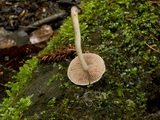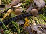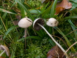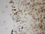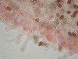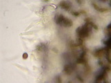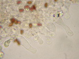 | Funddaten: 12.06.2008; MTB 7935-3-1-1, 550 m, Höllriegelskreuth, Isarleite, auf Erde mit Laubstreu (Laubmischwald mit Buchen, Eschen, Ahorn); Hut: 3,6 cm breit, stumpf gebuckelt, jung kaum gerieft, reif bis zum Scheitel durchscheinend gerieft, glatt, unterhalb des Scheitels minimal runzelig, jung goldbraun, später graubraun, am Scheitel ockerbraun, hygrophan, vom Scheitel her hell milchkaffeefarben ausblassend, reifer Fk ohne auffällige Velumspuren, junger Fruchtkörper durch schneeweißes, fast häutiges Velum fädig mit dem Stiel verbunden; Stiel: 6 cm lang, bis 0,4 cm breit, zylindrisch, mit mindestens 2 cm langer Scheinwurzel (bei einem von 3 Fk), satt cremefarben, apikal ganz schwach bereift/beschürfelt, sonst glatt; Lamellen: normal gedrängt, untermischt, breit angewachsen, sehr dünn, dunkelbraun mit schwachem Lilastich, Schneiden leicht konvex und fein weißflockig, nicht rötlich unterlegt; Fleisch: wässerig graubraun; Geruch: neutral; Geschmack: -; Cheilozystiden: LS ausschließlich aus Parazystiden, diese dichtstehend, keulig, gestielt birnenförmig oder blasig, dünnwandig, ca. 25-42 x 13-18; Pleurozystiden: mäßig häufig, utriform bis lageniform, meist etwas kopfig, 37-50 x 10-15 x 8-10 (Länge x Bauch x Kopf); Kaulozystiden: oft in 2-3gliedrigen Zellketten ausgebildet, Endzellen keulig, birnenförmig oder blasig, ca. 15-23 x 30-11, hyalin, mit Schnallen; Stielhyphen mit Schnallen; HDS: zellig, Zellbreite (in Aufsicht) ca. 25-55 µm; Basidien: 4-sporig, keulig, z.B. 18 x 8; Sporen: im Profil schwach bohnenförmig bis ellipsoid, in Aufsicht ellipsoid bis ovoid, nicht selten mit abgeflachter (abgestutzter) Apiculusseite, mäßig dickwandig, nicht immer mit durchgehender innerer Wandlinie, 7,4 x 4,3 (6,5-8 x 4-4,5), auch in Aufsicht kaum 5 µm Breite erreichend, Q=1,7 (1,6-1,8), relativ hell ockerbraun bis dunkelbraun, KP ca. 1,5 µm breit, zentral; Bestimmung: Stimmt in der ITS mit dem Epitypus von P. spadiceogrisea überein (Melzer 2018 in ZMykol 84); |