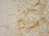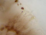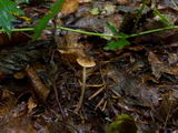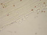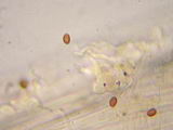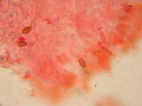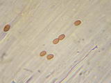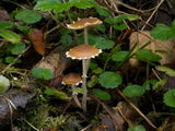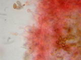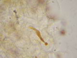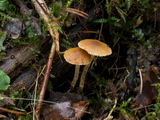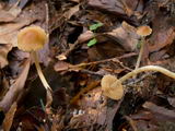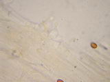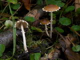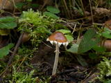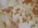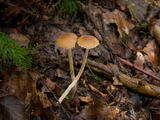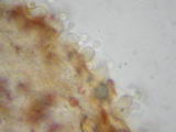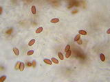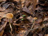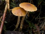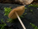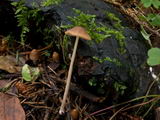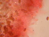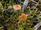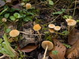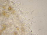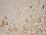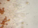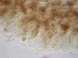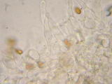 | Funddaten: 19.09.2009; MTB 8136-3-4-2, 760 m; Warngau, Taubenberg, Steingraben; Bergnadelwald, am Wegrand auf Erde mit etwas Nadelstreu; gesellig (3 Fk); Hut: bis 2,1 cm breit, kegelig, flachkegelig (nicht ganz aufschirmend), mit leicht abgesetztem fast spitzem, warzenförmigem Buckel, bis zum Scheitel durchscheinend gerieft, ziemlich freudig orangebraun, vor allem am Scheitel, zum Rand hin etwas heller und blasser (Orangetöne über Nacht verblassend); in der Fotovergrößerung keine Härchen erkennbar; hygrophan, Scheitel lange dunkel bleibend, mittlere Zone beige (cremeocker) ausblassend; Stiel: recht kurzstielig, bis 65 x 1,5 mm, zylindrisch, basal etwas erweitert bis kleinknollig, recht lebhaft orangebraun, nicht bereift, nicht behaart, an der Spitze kurzsstrichig silbrig überfasert, stielabwärts mit längeren Fasern überzogen; Lamellen: aufsteigend und schmal angewachsen, normal bis mäßig gedrängt (ca. 24 erreichen den Stiel), untermischt, ockerbraun; Schneiden leicht konvex, fein weißflockig; Fleisch: -; Geruch: unauffällig; HDS: zellig, Zellen keulig, blasig oder ballonförmig, eher dünnwandig, ca. 27-35 x 15-22; Pigment unauffällig, nur in den Pileozystiden deutlich; ohne Haare; Pileozystiden: lecythiform, dickwandig, oft unterteilt, am Ende mit Kopf und Halsteil (meist abgebrochen), mit Basalschnallen, +/- intensiv bernsteinfarbig; Cheilozystiden: lecythiform, dickbauchig, Hals meist kurz, bisw. bis 4 µm lang, Maße ca. 18-21 x 8-11 x 3,5-5; Kaulozystiden: fast ausschließlcih lecythiform, meist dickbauchig, Hals bis 4 lang, Maße 17-26 x 10-13 x 4-5, verstreut auch keulig-knubbelige Elemente; keine Haare; Basidien: 4-sporig; Ammoniakreaktion: nach 25 Min positiv; Sporen: subamygdaliform, dickwandig (bis 0,8 µm, beim Fokussieren manchmal rötlich), mit großem, bisw. etwas vorgewölbtem KP (bis 2), in Wasser blass ockergelb, in KOH ockerbraun; Maße: 10,6 x 6,1 (10-11,5 x 5,5-6,5), Q=1,75 (1,54-1,91), 20 Sp. gemessen; Bestimmung: Wegen der warmen Färbung und den frisch vollständig gestreifen Hüten wohl eher tenera als subalpina;