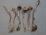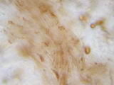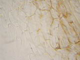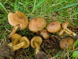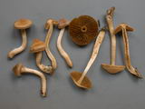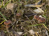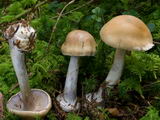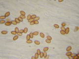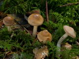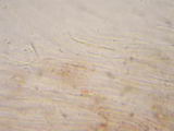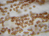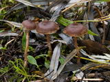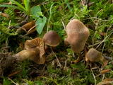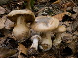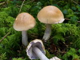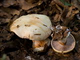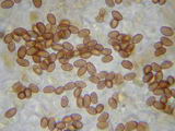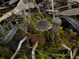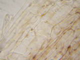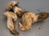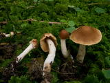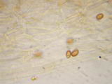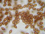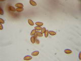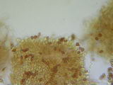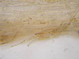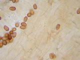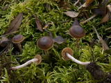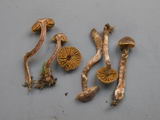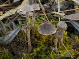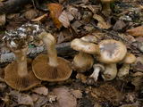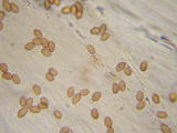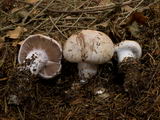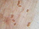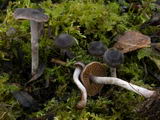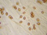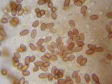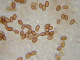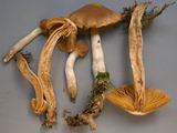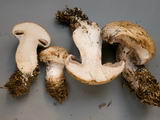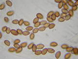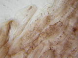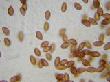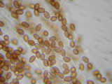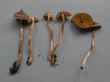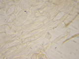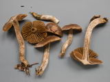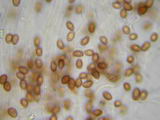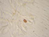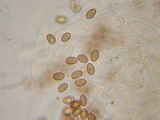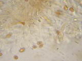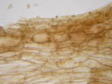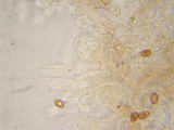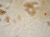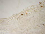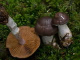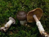 | Funddaten: 21.06.2009; MTB 7934-4-3-2, 630 m; Oberdill, Tannendickicht, im Moos (Bazzania trilobata), auf zumindest oberflächlich saurem Boden, bei jungen Tannen; gesellig (4 Fk), verges. mit Boletus erythropus; Hut: bis 5 cm breit, jung stumpfkegelig oder polsterförmig, bald konvex mit stumpfem Buckel, Rand lange etwas heruntergebogen, feucht schwach fettig, schwach glänzend, glatt; Hutrand jung durch silbrigweiße Cortina mit dem Stiel verbunden; Huthaut leicht abziehbar; Stiel: bis 7,5 x 2,2 cm, zylindrisch, basal keulig verdickt, vor allem jung sehr kompakt, an der Abrissstelle der Cortina mit deutlich abgesetzter (leicht vorstehender), aber nicht häutiger Ringzone, jung völlig vom weißen, bis cremeweißen Velum überzogen und bisweilen violett durchschimmernd, reif an der Spitze schmutzigweiß längsfaserig, unter der Ringzone mit aufreißenden, cremeweißlichen, ziemlich dicken Velumgürteln, überhalb der Basis oft rostfleckig; Lamellen: mäßig gedrängt bis entfernt, schwach ausgebuchtet angewachsen und bisw. mit Zähnchen herablaufend, jung hellbraun, bald dattelbraun, Schneiden weißflockig; Fleisch: im Hut wässerig braun bis lilabraun, im oberen Stieldrittel kräftig violett, in der unteren Hälfte verblasst, schmutzig ockergrau bis blassbräunlich; Geruch: schwach nach Kohlrabi; Geschmack: mild, auch etwas kohlrabiartig; Chemie: -; HDS: (beobachtet in Wasser) mäßig dünne Cutis aus 3-7 µm breiten Zellen, darunter gut ausgeprägtes Hypoderm mit 10-30 breiten, meist länglichen, kastenförmigen, dickwandigen Zellen, Pigment unauffällig, am ehesten membranär im Hypoderm, in tieferliegenden Schichten auch scheinbar inkrustierend (in der Zellwand?); Stipitipellis: -; Lamellentrama: schwach ocker inkrustiert; Lamellenschneide: steril, Marginalzellen keulig, subzylindrisch oder rundlich, z.B. 17x8, 20x6, 14x10, 12x9, 30x6,5; Basidien: oft blass gelblich, keulig, ca. 24-34 x 8-10; Sporen: ellipsoid, Apex stets breit gerundet, Basis etwas. verschmälert, bisw. mit leichter subapicularer Depression (dann etwas apfelkernförmig wirkend), normal warzig, am Apex grobwarzig, indextrinoid, Maße: 9,1 x 5,7 (7,5-10,5 x 5,5-6), Q=1,60 (1,36-1,75), 20 Sp. gemessen; Bestimmung: nicht sequenziert, aber aus dem selben Myzel wie die sequenzierte Kollektion 2008-11 |
