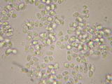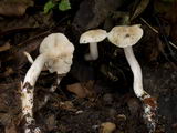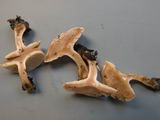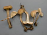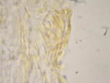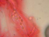 | Funddaten: 23.10.2009; Fundort: MTB 8034-4-1-4, 580 m; Aumühle, Pupplinger Weiher; im Fichtenwald, bei mittelgroßen Fichten in der Nadelstreu; gesellig bis büschelig (>5 Fk); vergesellschaftet mit Cort. varius und Tricholoma vaccinum;; Hut: bis 2,4 cm breit, jung gewölbt mit stark herabgezogenem Rand, später lang so bleibend, aber im Zenrum stets vertieft bis genabelt, alt flacher gewölbt, Oberfläche völlig glatt, leicht fettig, matt bis schwach glänzend, nur alt am Rand angedeutet durchscheinend gestreift, sonst ungerieft; cremebeige bis hell ockerbraun (junge Exemplare am dunkelsten gefärbt); stark hygrophan, vom Scheitel her cremebeige bis satt cremefarben ausblassend; Stiel: bis 4,5 x 0,6, oft exzentrisch inseriert, von oben nach unten sich stark verjüngend, im oberen Drittel häufig abgeplattet und schwach längsfurchig, nur im oberen Drittel hohl, basal ausspitzend, schwach längsfaserig, kahl, an und über der Basis bisw. schwach weißfilzig oder etwas striegelig, satt cremefarben bis cremebeige, meist etwas heller als der Hut; Lamellen: bogig herablaufend, mäßig gedrängt, ca. 2 mm breit, dicklich, satt cremefarben; Schneiden konkav, gleichfarbig und glatt; Fleisch: im Hutkern weiß, sonst wässrig hutfarben, im Stielkern weißlich, sonst wässrig cremebeige; Geruch: mehlig, im Schnitt mehlig-gurkig; Geschmack: mild, nach einigem Kauen unangenehm ranzig; Sporenpulver: weiß, maximal cremeweiß (Abwurf schwach); HDS: ein Chaos (Trichoderm) aus relativ schmalen (2-4) Hyphen, die teilweise parallel liegen, teilweise verflochten sind, mit oft aufsteigenden, bisw. knorrig-welligen und oft apikal etwas aufgeblasenen Endzellen, oberste Schicht der Zellen teils gelifiziert; Pigment unauffällig, am ehesten in den dickwandigen Zellen der Subcutis; Subcutis und Hutfleischhyphen unregelmäßig verflochten, Zellen kurz septiert; Schnallen vorhanden; Stielrinde: -; Cheilozystiden: -; Pleurozystiden: -; Kaulozystiden: -; Basidien: 4-sporig, schlankkeulig, ca. 25-31 x 5-6, mit Basalschnallen; Lamellentrama: mit Schnallen, nicht inkrustiert; Sporen: regulär ellipsoid bis subzylindrisch, winzig, 4,3 x 2,8 (3,5-4,5 x 2,5-3), Q=1,54 (1,40-1,80); Bestimmung: Mit den Schlüsseln in Funga Nordica und Gröger komme ich zu keinem vernünftigen Ergebnis. Man stolpert über folgende Arten: C. diosma, lohjaensis, marginella, diatreta, leucodiatreta |