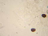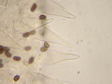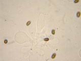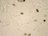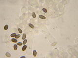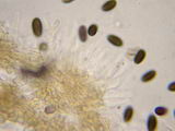 Sporen: im Profil schmal ellipsoid und bisw. mit schwacher subapikulärer Depression, in Aufsicht auf der Apikulusseite wesentlich breiter und so kartoffelsackförmig, schwach dickwandig, KP ca. 1,2-1,5, graubraun (mehr grau als braun); Maße: 8,5 x 4,7 (8-9 x 4,5-5,5), Q=1,79 (1,64-1,89); 5,5 in der Breite werden nur in Aufsicht erreicht!;