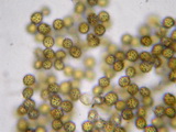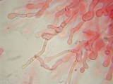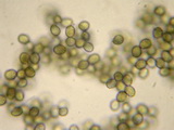 Sporen: breit ellipsoid, im Umriss rau, Ornament aus sehr niedrigen Warzen, die durch feinstrichige Verbindungen zu seinem erahnbaren, aber wohl unvollständigen Netz verbunden sind; Maße: 8,1 x 6,4 (7,5-9 x 6-7), Q=1,27 (1,15-1,38);