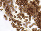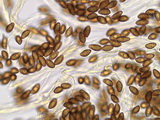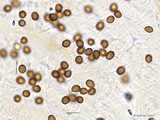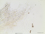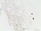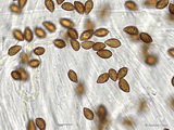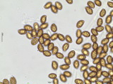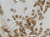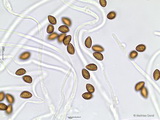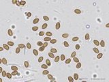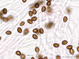 Sporen: amygdaloid, Apex nicht ausgezogen, grob warzig, Warzen teils etwas zusammenfließend und Krusten bildend, Maße: 8,9 x 5,4 (8,5-9,5 x 5-6), Q=1,63 (1,55-1,73), 20 Sp. gemessen;