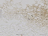 HDS: Dünne Cutis, Zellen ca. 3-7 breit, feinst inkrustiert bis hyalin, mit vielen Lochschnallen; Hypoderm normal entwickelt, Zellbreite ca. 10-20, teils gelbbraun quergestreift inkrustiert und mit inkrustierendem körnigem Dickwandpigment;