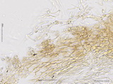 HDS: Ixocutis, ca. 250 µm dick (schwer zu messen vom Exsikkat, fliegt bei dünnen Schnitten auseinander in KOH), Zellen hyalin oder gelblich, nicht quergestreift, höchstens minimal feinst inkrustiert; Hypoderm schwach ausgeprägt, Zellen nicht über 10 µm breit, mit blass gelblichem Dickwandpigment, ohne auffallende Inkrustationen;
