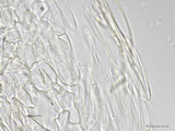 Lamellenschneide: mit zahlreichen sterilen, keulig-blasigen Zellen (oft etwas verpappt und dann schlecht zu sehen), diese nicht größer als die Basidien;