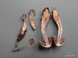 Stiel: bis 6 x 1,2 cm (Keule bis 2,4 dick), basal stark keulig und dann verjüngt (fast rübenartig wurzelnd); cremebeige bis schmutzig blassbraun; Velum unauffällig (keine sehr junger Fk vorhanden);