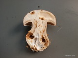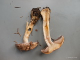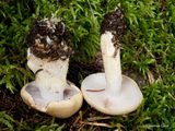 Stiel: kurz, 3 x 2 cm, basal knollig, weiß; Knolle einseitig angedeutet gerandet, basal flach konisch, weiß, unterseits schmutzig weiß bis beige verfärbt;