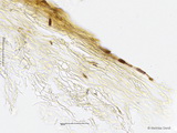 HDS: Ixocutis, über 275 µm dick, Zellen teilweise gelifiziert, sonst hyalin bis deutlich quergestreift inkrustiert (gelb bis gelbbraun); Hypoderm schwach entwickelt, Zellen kaum über 12 µm breit, mit gelbem Dickwandpigment, schmalere Zellen quergestreift inkrustiert;