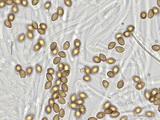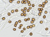 Sporen: subglobos, mäßig grob warzig, Warzen eher klein, knapp überstehend und dicht; Maße: 7,4 x 6,3 (6,8-8,1 x 5,9-6,8), Q=1,16 (1,10-1,27), 20 Sp. gemessen;