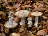 Stiel: bis 6,5 x 2,5 cm, +/- keulig, nicht knollig, cremeweiß; Velum weiß, aber bisw. vor allem an der Abrisszone schwach gilbend, dünn;