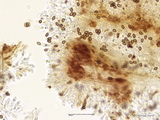 Cortina: Zellen in KOH stellenweise mit orangerosa Pigmenten.