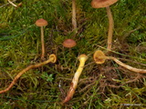 Stiel: bis 8,5 x 0,5, tief im Moos steckend, gelb, alt mit Olivtönen, basal meist weit herauf orangerosa überzogen; Velum wohl orangerosa, bei den jüngsten Fk sind orangerosa Flecken und Streifen am Stiel (möglicherweise auch Velumreste), dünn, am Hut nicht oder sehr schwach ausgeprägt; Basalmyzel und Rhizomorphen orangerosalich;