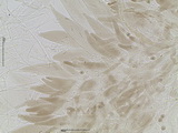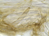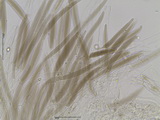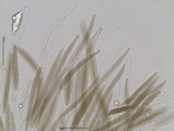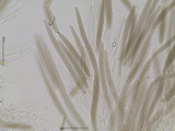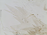 HDS: Nahe der Hutmitte ein Trichoderm aus schlanken, zylindrischen Zellen, intrazellulär diffus braun pigmentiert, Septen mit Schnallen; Endzellen apikal verjüngt, Maße ca. 80-143 x 8-12; Breite der Trägerzellen bis 16 µm;