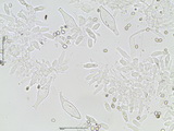 Stieloberfläche: in der Mitte kahl, im unteren Drittel mit schlank spindeligen bis zylindrischen Kaulozystiden und vielen, +/-zylindrischen Endzellen, die auffallend feinkörnelig gelbbraun pigmentiert sind;