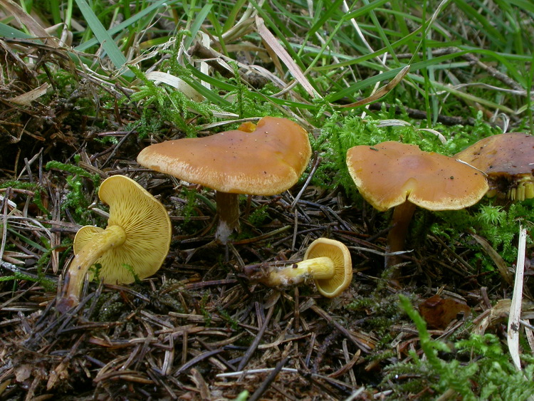 Beschreibung:Hut: 3-4,5 cm breit, ausgebreitet, höchsten schwach und stumpf gebuckelt, trocken, +/- glatt, an der OL rauh wie Gummig (lässt sich nicht schmierig machen), lebhaft orangebraun, Hutrand durch graugelbe, abwischbare Bereifung meist deutlich heller abgesetzt, bei jungen FK ganzer Hut bereift; Stiel: bis 3 cm lang, bis 0,8 cm breit, zylindrisch, oft etwas breitgedrückt, hohl, basal stark mit dem Substrat verwachsen und eher etwas verjüngt, Spitze manchmal erweitert, Oberfläche bisweilen mit graugelblichem Reif überzogen, bisweilen auch glatt, an der Spitze intensiv gelb (wie die Lamellen), zur Basis hin mehr orangegelb und vor allem im unteren Drittel alt nach orangebraun und bis schwarzbraun umfärbend; Lamellen: sehr gedrängt, untermischt, breit angewachsen, eher schmal, lebhaft gelb bis orangegelb, Schneiden glatt bis schwach schartig; Fleisch: im Hut- und Stielinneren weißlich-hellgelb bis zitronengelb, in der Stielrinde zitronen- bis orangegelb, manchmal olivgelb bis fast schwärzlich fleckend, über den Lamellen mit hyaliner, wässriger Zone, unter der Huthaut wässrig orangegelb; Geruch: im Schnitt nach Mehl, später banal pilzig; Geschmack: sehr bitter; Lamellenschneide fertil, keine Zystiden; alle Fk-Teile mit Schnallen; HDS: hyphig, aus trichodermal verwobenen Hyphen (ca. 3-5 µm breit), oberste Schicht gelatinisiert; Basidien: 4-sporig Sporen: rundellipsoid, glatt, ohne KP, dickwandig, ca. 3-3,5 x 2,5-3;