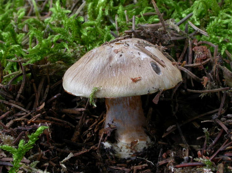 Beschreibung:Hut: knapp 4 cm breit, fein eingewachsen faserig und mit graulichem Velum bereift, haselnussbraun mit Olivton (vor allem am Hutrand), mit Streuresten behaftet, befeuchtet leicht klebrig bis schmierig, sonst komplett trocken (bei extrem trockener Witterung); Stiel: bis ca. 5 cm lang, zylindrisch, blass silbrig blau, an der Spitze etwas intensiver, mit durch Sporen rostbrauner Ringzone, Basis gerandet knollig und von blass bis kräftig ockergelblichem Velum überzogen; Lamellen: jung violett, dann violettbraun, aufsteigend bis breit angewachsen, Schneiden fein gekerbt und etwas heller bis gleichfarben; Fleisch: im Hut weißlich, mit wässriger Zone über den Lamellen, im oberen Stielbereich (etwa bis zur Mitte) blassblau, zur Basis hin mehr cremefarben und in der Basis selbst blass ockergelb; Geruch: deutlich nach Mehl; Geschmack: gurkig-mehlig; KOH auf Hutfleisch: ockergelb KOH auf Huthaut: rötlichbraun Lugol auf Hutfleisch: orangegelb Sporen: zitronenförmig, grobwarzig, 9,8 x 5,7 (9-10,5 x 5,5-6); Q=1,73;