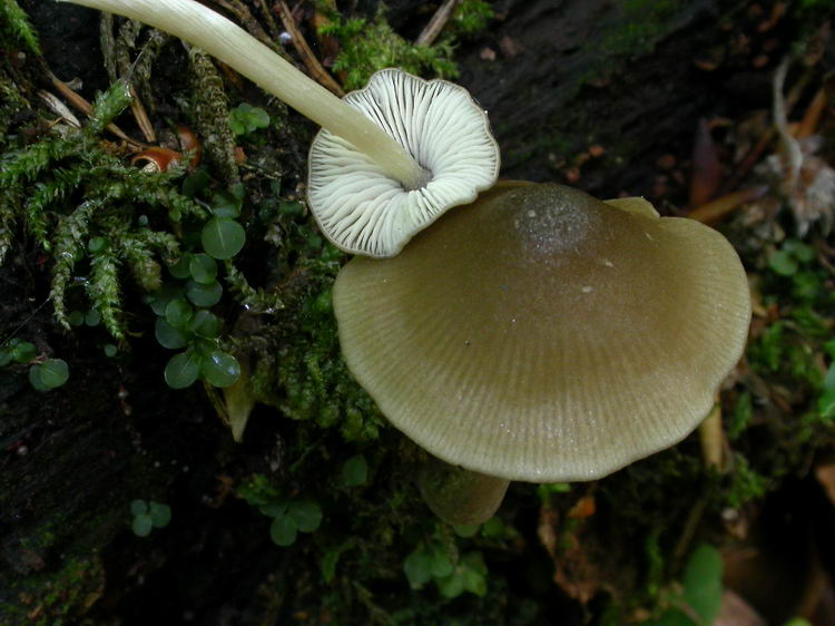 | Beschreibung: | Hut: 1,4-2,2 cm breit, stumpf gebuckelt, hygrophan, zu 2/3 durchscheinend gerieft, radialstreifig, olivbraun, am Scheitel dunkler, Rand heller, beim Austrocknen milchkaffeefarben ausblassend;