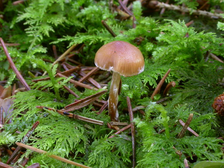Stiel: bis 4 cm lang, an der Spitze ockergelb, zur Basis hin immer dunkler rötlichbraun, apikal weißlich bereift, Ringzone häutig, aber sehr vergänglich, sehr tief sitzend, darunter (und bisweilen auch darüber) mit Velumresten weiß überfasert;