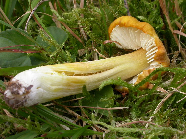 Stiel: 7 cm lang, bis 1,2 cm breit, längsfaltig bis -rissig, hellbelb mit grünlichem Schimmer, basal weißlich und zugespitzt