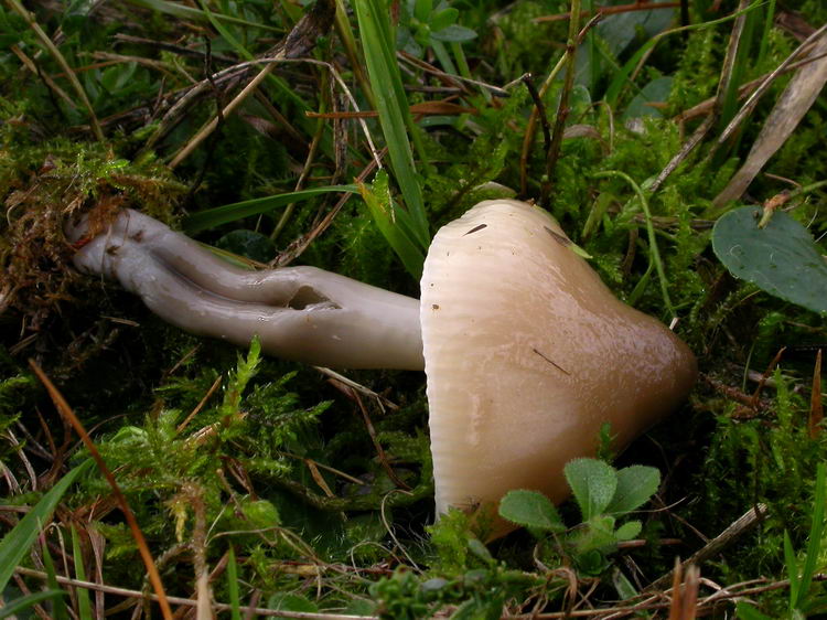 Stiel: ca. 6 cm lang, zylindrisch, hohl, in der unteren Hälfte verbogen, breitgedrückt und durch tiefe Furche geteilt, klebrig, im oberen Drittel hellgrau und durchscheinend genattert, zur Basis hin dunkel grau bis graubraun, Basis zugespitzt und hellgrau bis fast milchweiß;