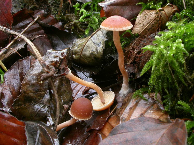 | Beschreibung: | Hut: bis 1,6 cm breit, nicht oder nur am Rand durchscheinend gerieft, am Scheitel kastanien- bis dattelbraun, zum Rand hin heller blütenhonigfarben, Hutrand mit weißlichen Velumresten behaftet;